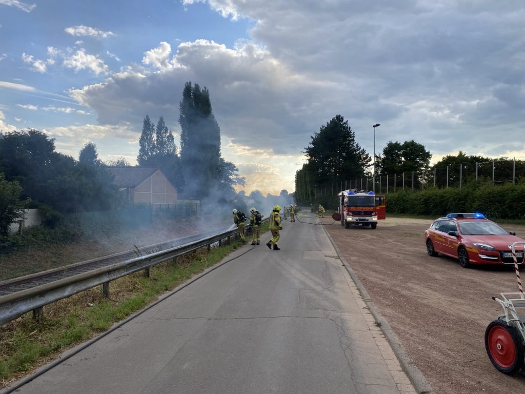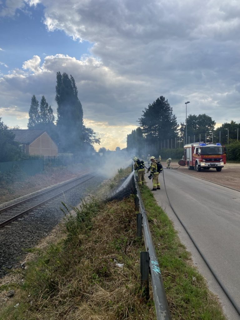 Am Samstagabend kam es im Bereich „An der Waidmühl“ zu zwei Brandeinsätzen, die die Feuerwehr Herzogenrath forderten. Gegen 19:00 Uhr wurde zunächst ein Flächenbrand entlang der Bahnlinie der Euregio Bahn gemeldet. Beim Eintreffen der Einsatzkräfte standen etwa 90 Quadratmeter Grasfläche in Flammen. Aufgrund der Rauchentwicklung und zur Sicherheit der Einsatzkräfte wurde der Bahnverkehr im betroffenen Abschnitt vorübergehend eingestellt. Mit drei Strahlrohren konnte das Feuer zügig unter Kontrolle gebracht und gelöscht werden.