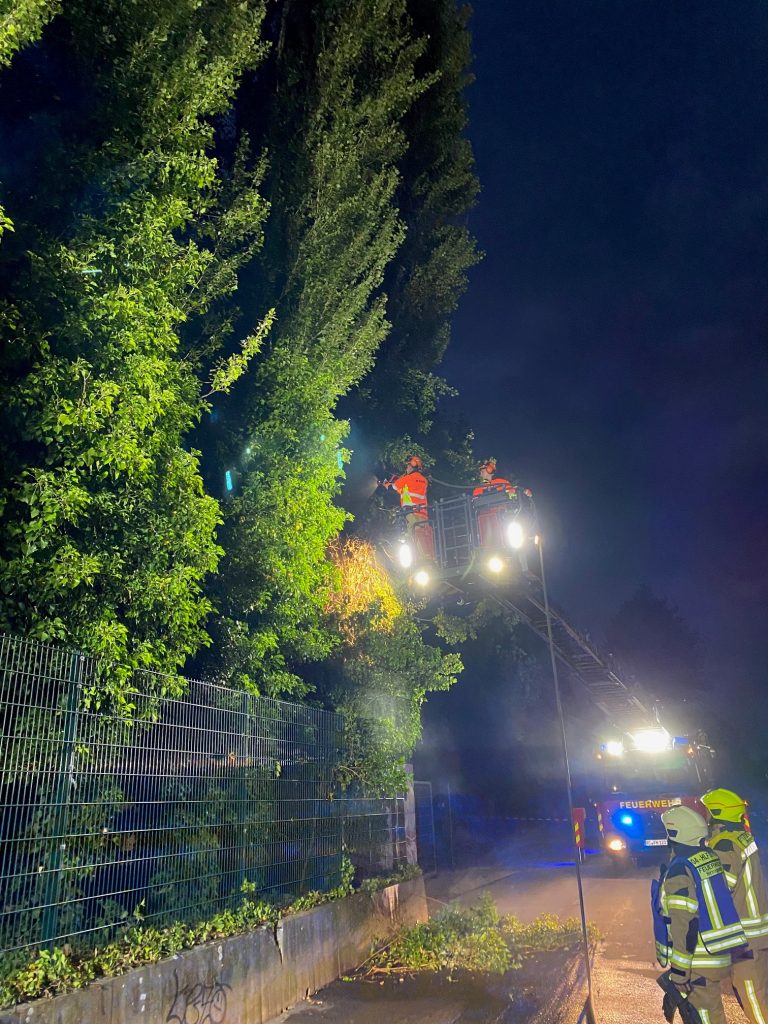 Nur wenige Stunden später, gegen 21:45 Uhr, erfolgte die nächste Alarmierung. Erneut ein Flächenbrand in der Straße „An der Waidmühl“, diesmal auf dem Gelände eines Sportplatzes. Dort standen zwei Bäume in Brand. Durch den schnellen Einsatz von zwei Strahlrohren konnte ein Übergreifen der Flammen auf die Baumkronen verhindert werden. Bei einem der Bäume handelte es sich um einen hohlen Stamm, in dem sich das Feuer ins Innere ausgedehnt hatte. Um eine vollständige Brandbekämpfung zu ermöglichen, wurde mithilfe der Drehleiter in etwa fünf Meter Höhe eine Öffnung mittels Kettensäge geschaffen. Der brennende Hohlraum konnte anschließend gezielt abgelöscht werden.